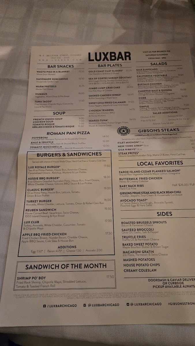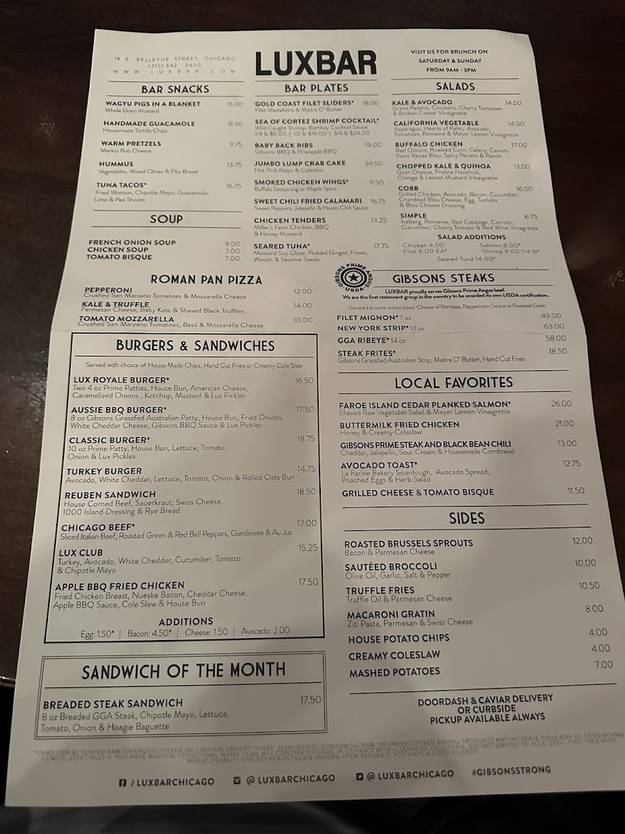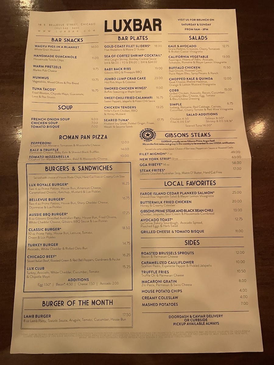 Welcome to LUXBAR, a vibrant American restaurant nestled in the heart of Chicago at 18 E Bellevue Pl. This urban culinary gem is a beloved spot for both locals and visitors, offering a delightful blend of classic American comfort food and sophisticated dining in a polished yet relaxed atmosphere.